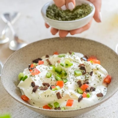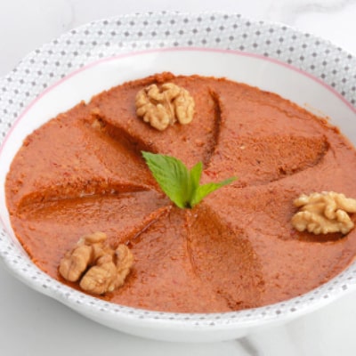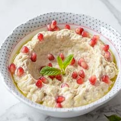 roasted eggplants mash, tahini and lemon juice drizzled with olive oil
