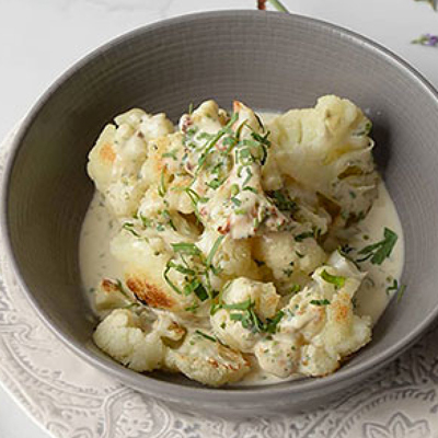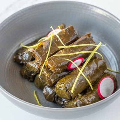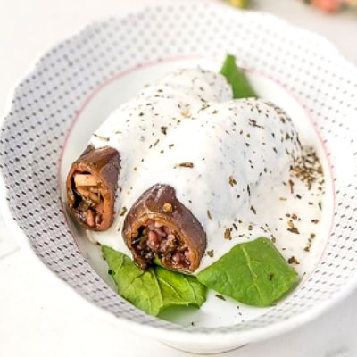 2 piece of eggplant stuffed with yogurt deep on a bed of Rocca