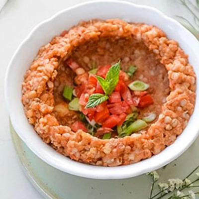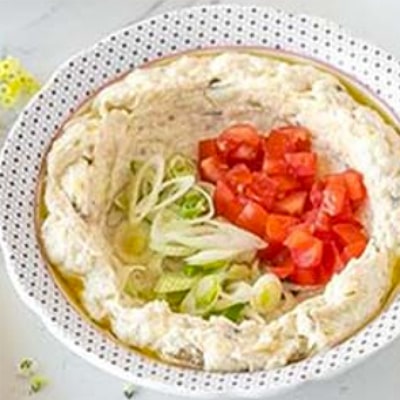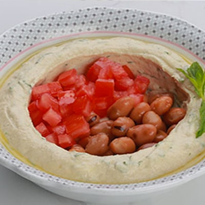 Revisited hummus mash with fava beans, and cumin, topped with freshly diced tomatoes