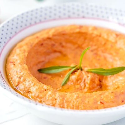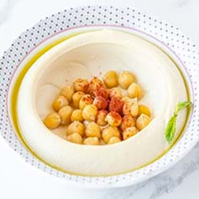 Mashed chickpeas appetizer with tahini and drizzle of olive oil