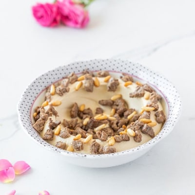 Mashed chickpeas with tahini, topped with a delicious mix of chopped beef and pine nuts .