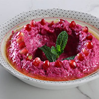 Mashed eggplant assorted with fresh beetroot topped with pomegranate .