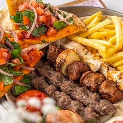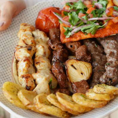 An assortment of 1 Skewer beef brochettes, 1 Skewer chicken Taouk, 1 Skewer kafta meat, 1 Skewer kabab