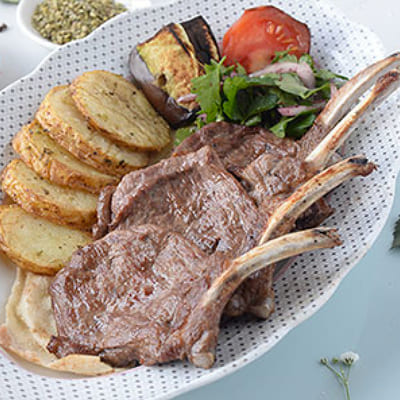 Tender Lamb rack bone in seasoned withLeila spices grilled and served with french fries .