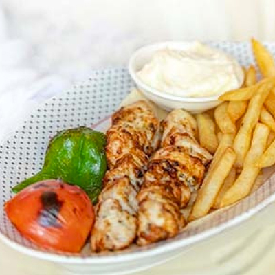 Skewers of Chicken Brochettes grilled Served With Grilled Vegetables, golden french fries and Garlic Dip.