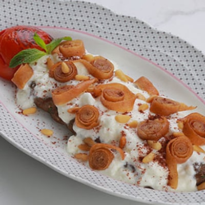 Grilled kafta served with yogurt, fried Lebanese bread , pine nuts and a sprinkle of sumac .