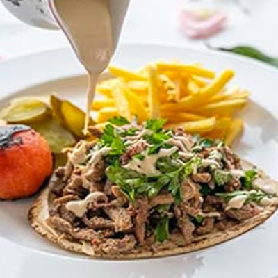 Shawerma plate served with biwaz salad, French fries and tahini sauce.