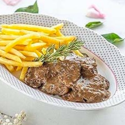 Beef strips served with our signature mushroom sauce and golden french fries .