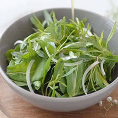 Rocca leaves, green thyme, onions, lemon juice and extra virgin olive oil.