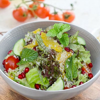 White quinoa with lettuce, cucumber, tomato, mint, orange , pomegranate with lemon juice and extra virgin