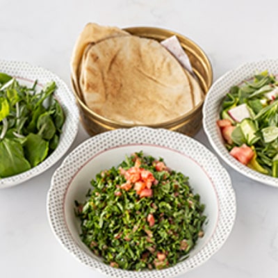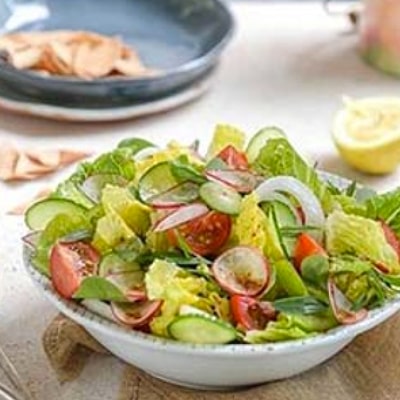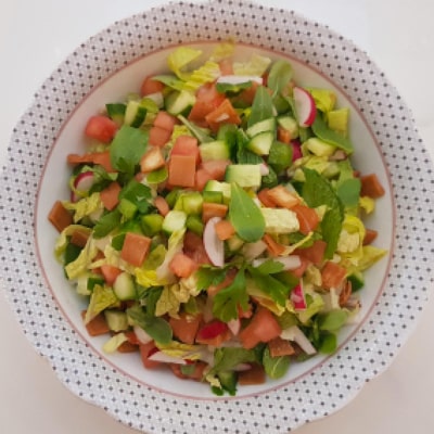 Lettuce, watercress, rocca, mint, tomato, cucumber, radish, sweet pepper, green onion, sumac salt, lemon