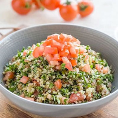 Quinoa mixed with fresh tomatoes, dry mint,parsley, onions, sweet pepper, lemon juice and extra virgin olive