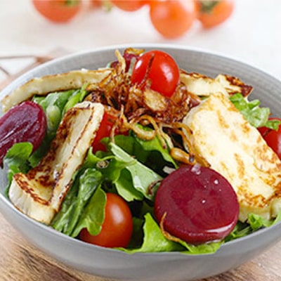 Lettuce, rocca, beetroot, tomato topped with grilled halloumi served with vinegar sauce .