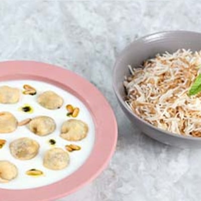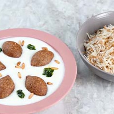 Kebbeh Balls cooked in yoghurt served with white rice vermicelli .
