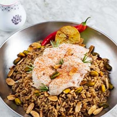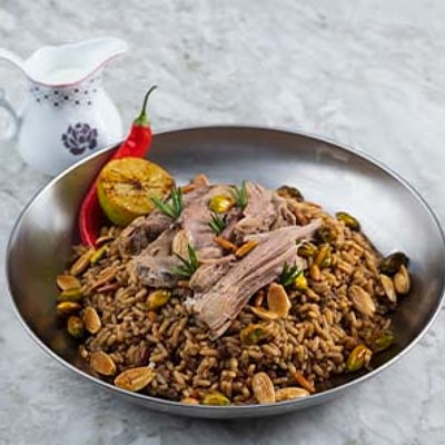 Lebanese chich barak dumplings cooked in yoghurt served with white rice vermicelli.