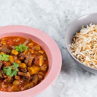 Rich and flavorsome okra stew with tomato sauce and meat served with white rice vermicelli .